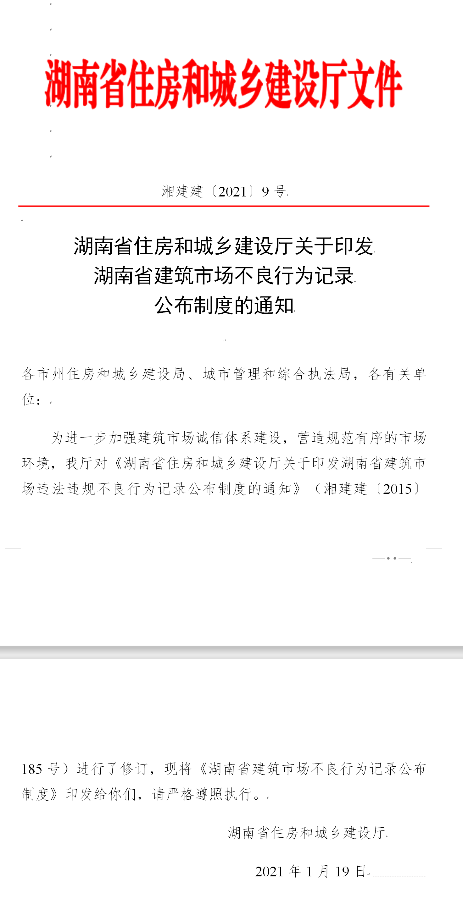 第九條 湖南省建筑市場不良行為記錄原則上每季度公布一次。各級住房城鄉(xiāng)建設主管部門應于每季度后第一個月10日前將本地區(qū)不良行為記錄匯總上報省住房城鄉(xiāng)建設廳,必要時也可立即上報。省住房城鄉(xiāng)建設廳對各級住房城鄉(xiāng)建設主管部門上報信息進行匯總后,以文件形式統(tǒng)一公布,并同時在我廳官網(wǎng)上發(fā)布。根據(jù)實際情況,省住房城鄉(xiāng)建設廳必要時可即時對不良行為記錄予以公布。責任單位不良行為記錄公布期限為自公布發(fā)文之日起180天,責任人不良行為記錄公布期限為自公布發(fā)文之日起720天。
