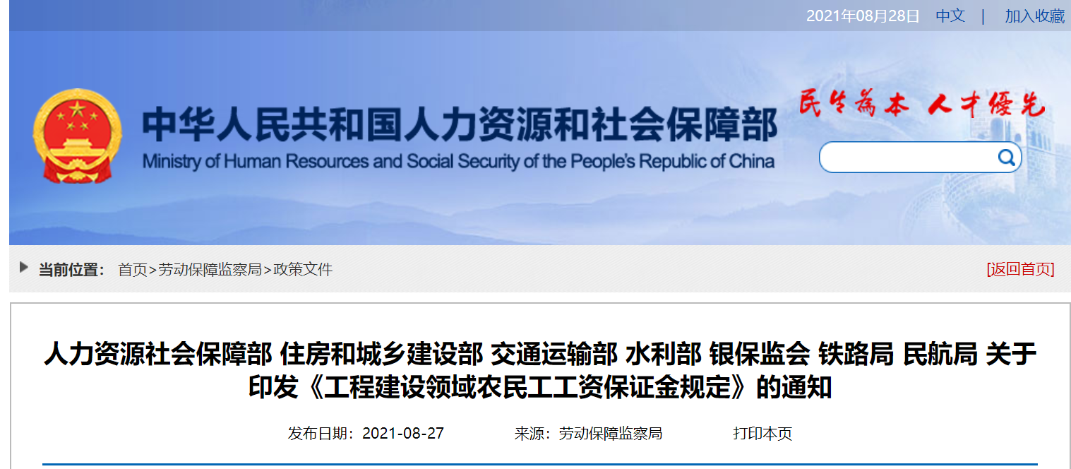 8月27日,人力資源社會保障部 住房和城鄉(xiāng)建設(shè)部 交通運輸部 水利部 銀保監(jiān)會 鐵路局 民航局印發(fā)《工程建設(shè)領(lǐng)域農(nóng)民工工資保證金規(guī)定》,原文通知如下: