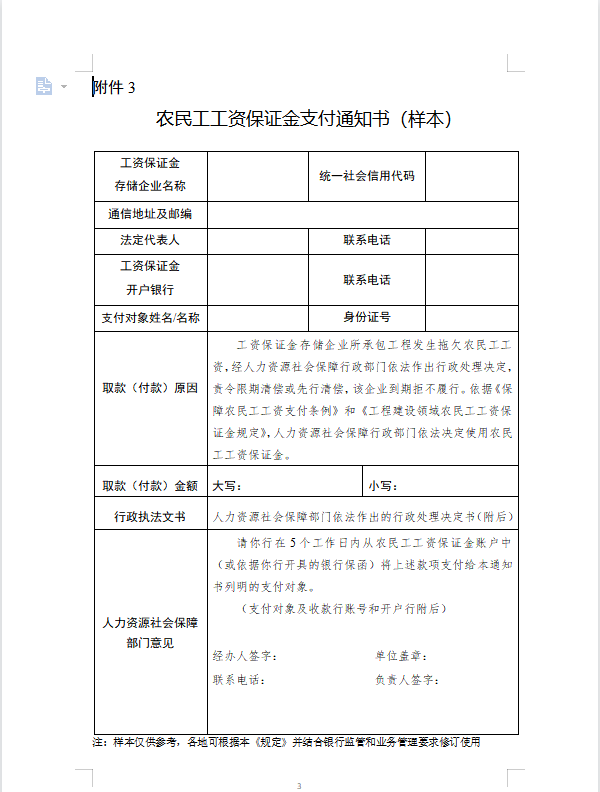 3.農(nóng)民工工資保證金支付通知書(樣本)