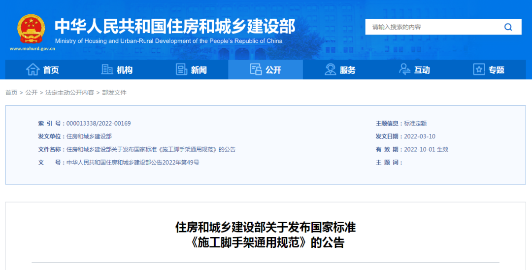 住房和城鄉(xiāng)建設(shè)部關(guān)于發(fā)布國(guó)家標(biāo)準(zhǔn)《施工腳手架通用規(guī)范》的公告