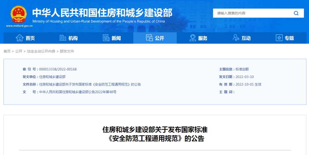 住房和城鄉(xiāng)建設(shè)部關(guān)于發(fā)布國(guó)家標(biāo)準(zhǔn)《安全防范工程通用規(guī)范》的公告