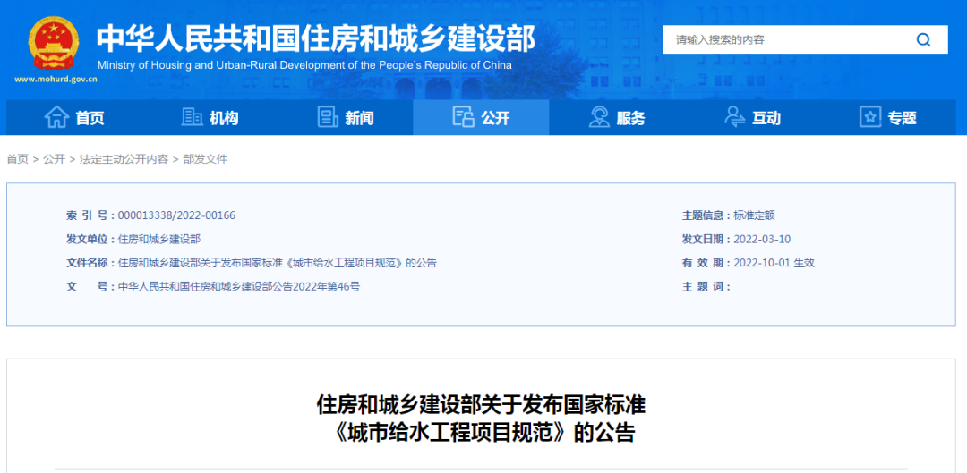 住房和城鄉(xiāng)建設(shè)部關(guān)于發(fā)布國(guó)家標(biāo)準(zhǔn)《城市給水工程項(xiàng)目規(guī)范》的公告
