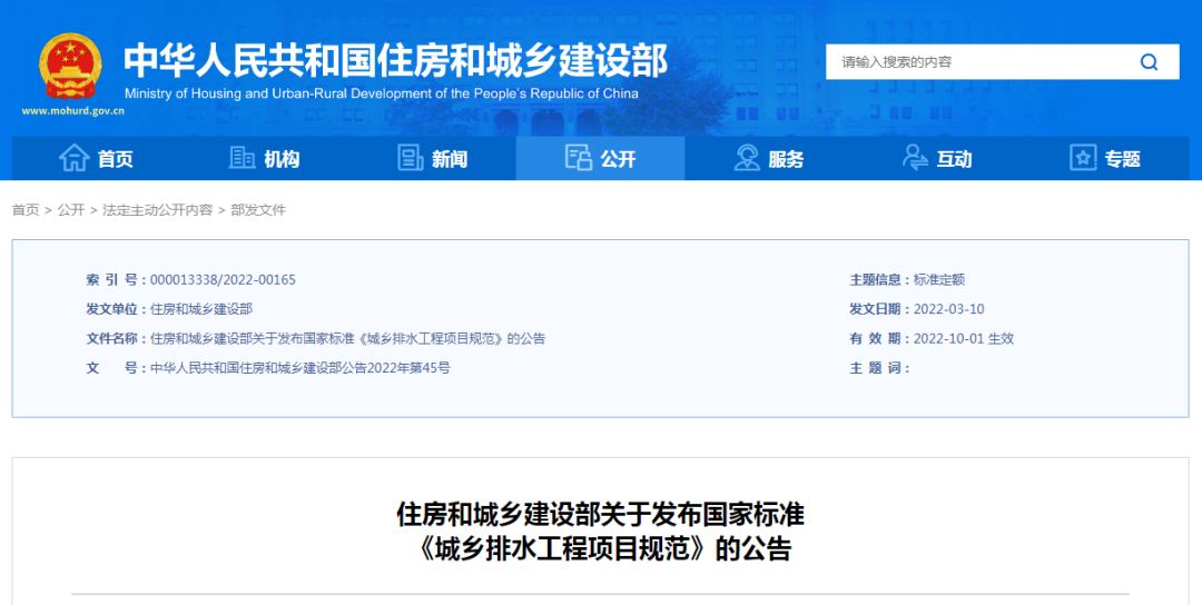 住房和城鄉(xiāng)建設(shè)部關(guān)于發(fā)布國(guó)家標(biāo)準(zhǔn)《城鄉(xiāng)排水工程項(xiàng)目規(guī)范》的公告