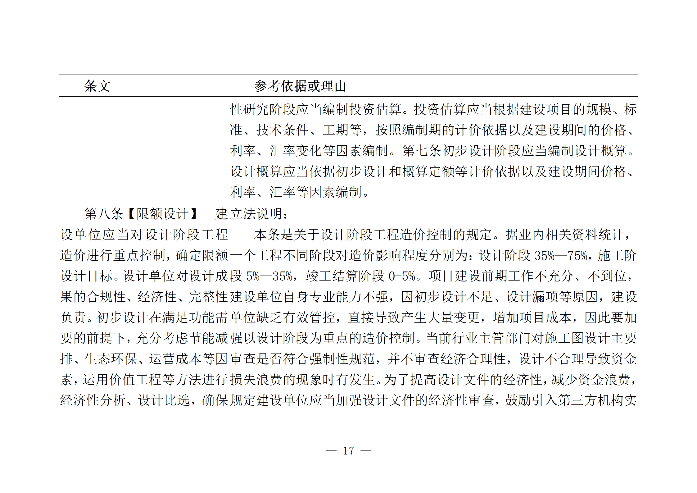 第八條【限額設(shè)計】 建設(shè)單位應(yīng)當(dāng)對設(shè)計階段工程造價進(jìn)行重點(diǎn)控制,確定限額設(shè)計目標(biāo)。設(shè)計單位對設(shè)計成果的合規(guī)性、經(jīng)濟(jì)性、完整性負(fù)責(zé)。初步設(shè)計在滿足功能需要的前提下,充分考慮節(jié)能減排、生態(tài)環(huán)保、運(yùn)營成本等因素,運(yùn)用價值工程等方法進(jìn)行經(jīng)濟(jì)性分析、設(shè)計比選,確保概算不超過投資估算。施工圖設(shè)計及預(yù)算應(yīng)當(dāng)符合批準(zhǔn)的初步設(shè)計及概算。
