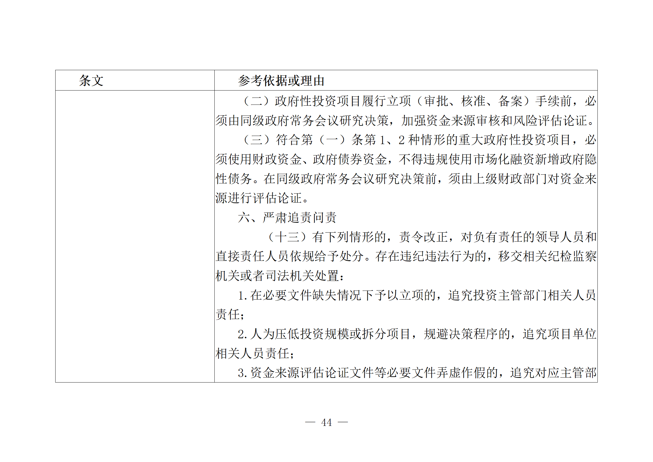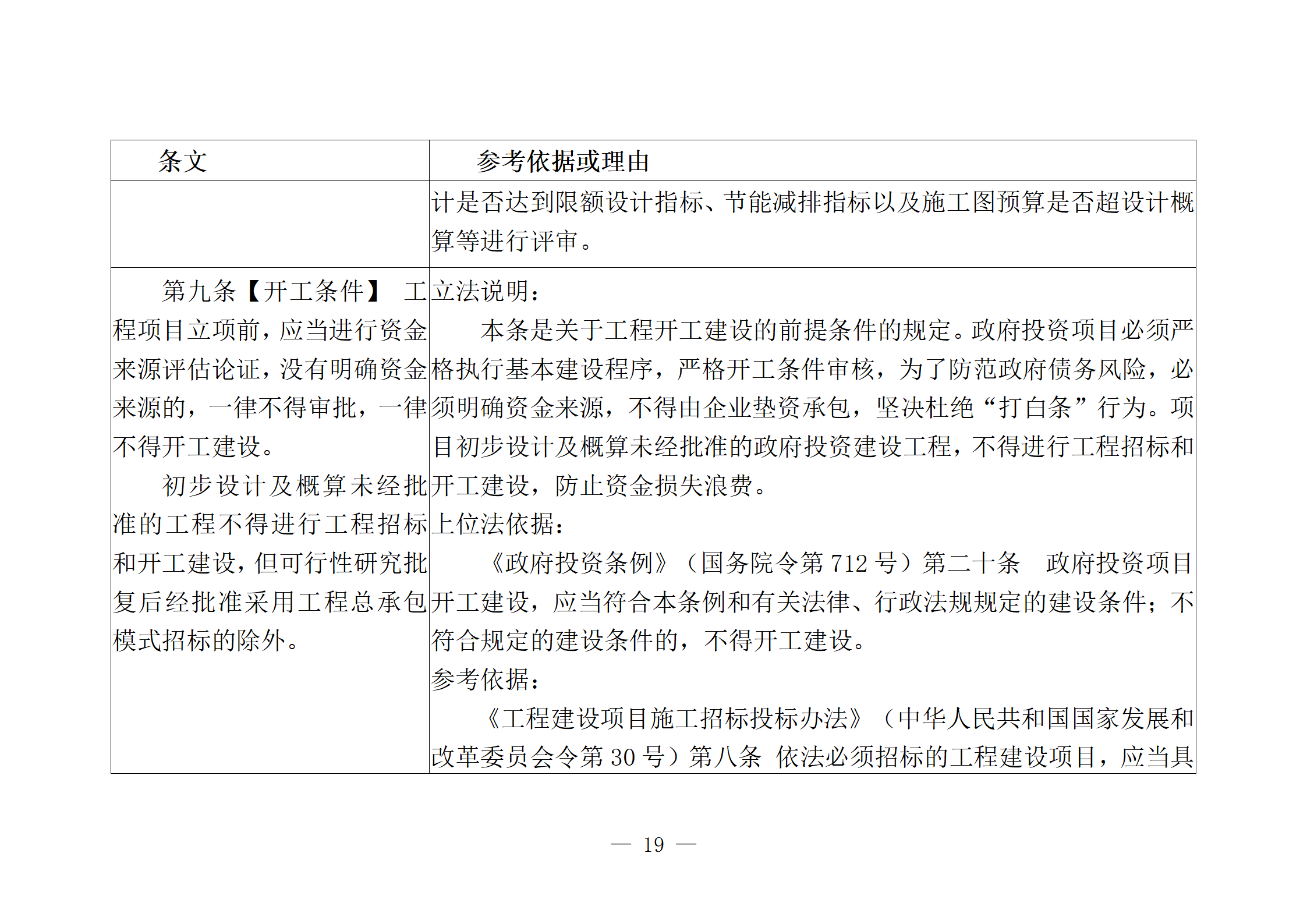 第九條【開工條件】 工程項目立項前,應(yīng)當(dāng)進(jìn)行資金來源評估論證,沒有明確資金來源的,一律不得審批,一律不得開工建設(shè)。