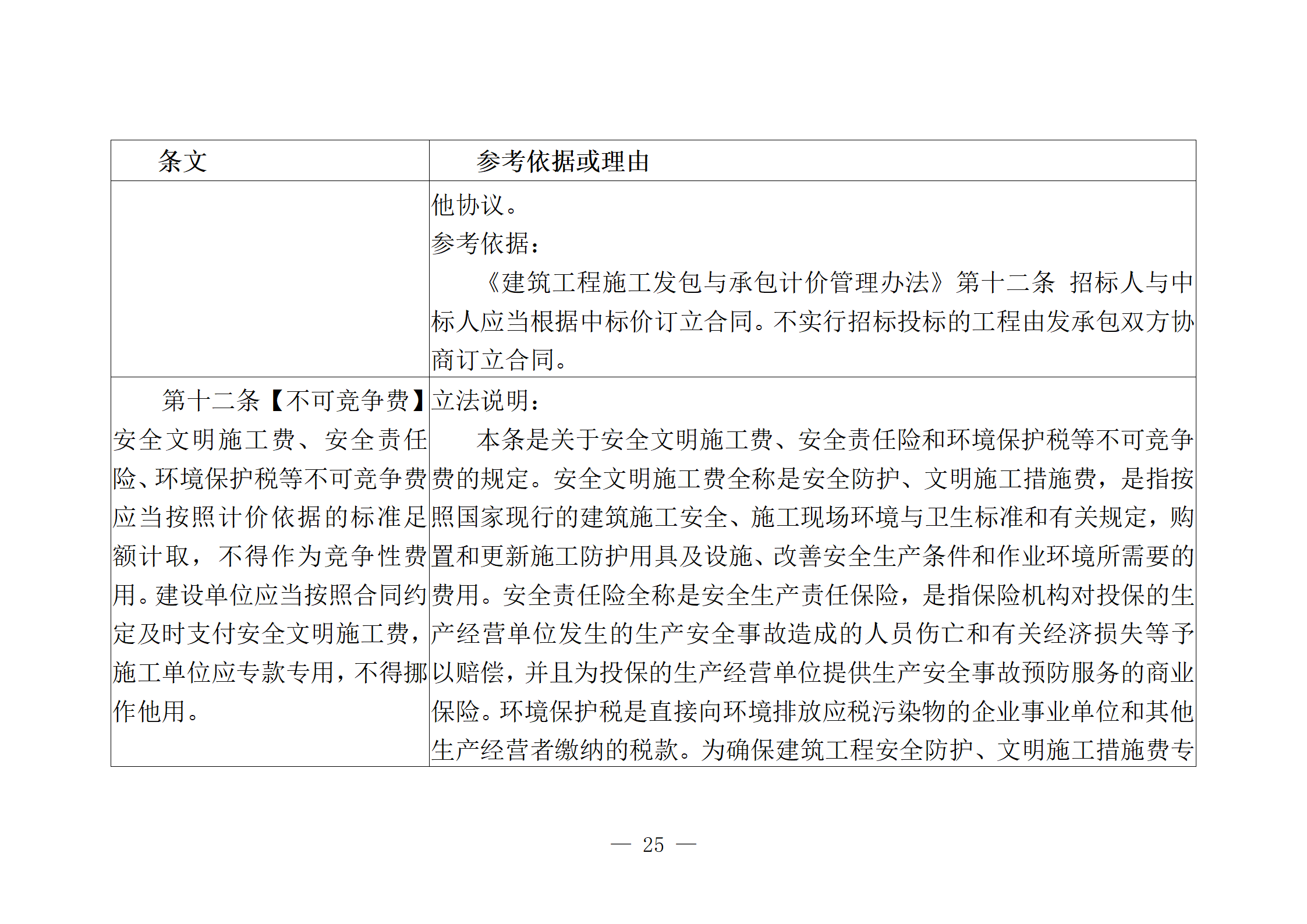 第十二條【不可競爭費(fèi)】 安全文明施工費(fèi)、安全責(zé)任險、環(huán)境保護(hù)稅等不可競爭費(fèi)應(yīng)當(dāng)按照計價依據(jù)的標(biāo)準(zhǔn)足額計取,不得作為競爭性費(fèi)用。建設(shè)單位應(yīng)當(dāng)按照合同約定及時支付安全文明施工費(fèi),施工單位應(yīng)??顚S?,不得挪作他用。