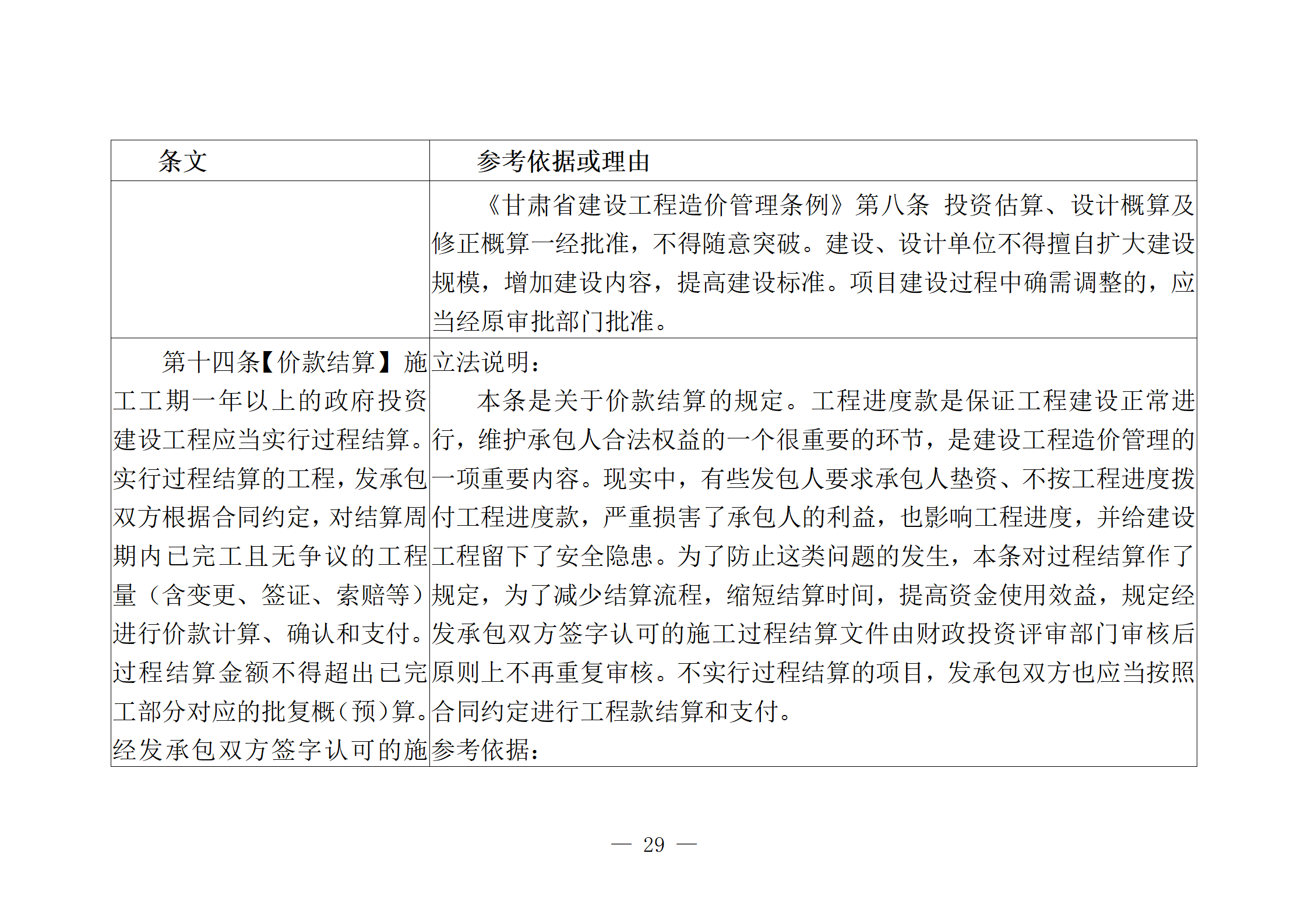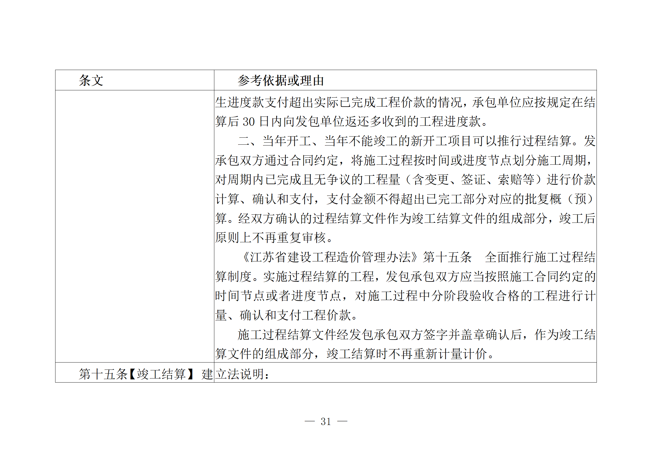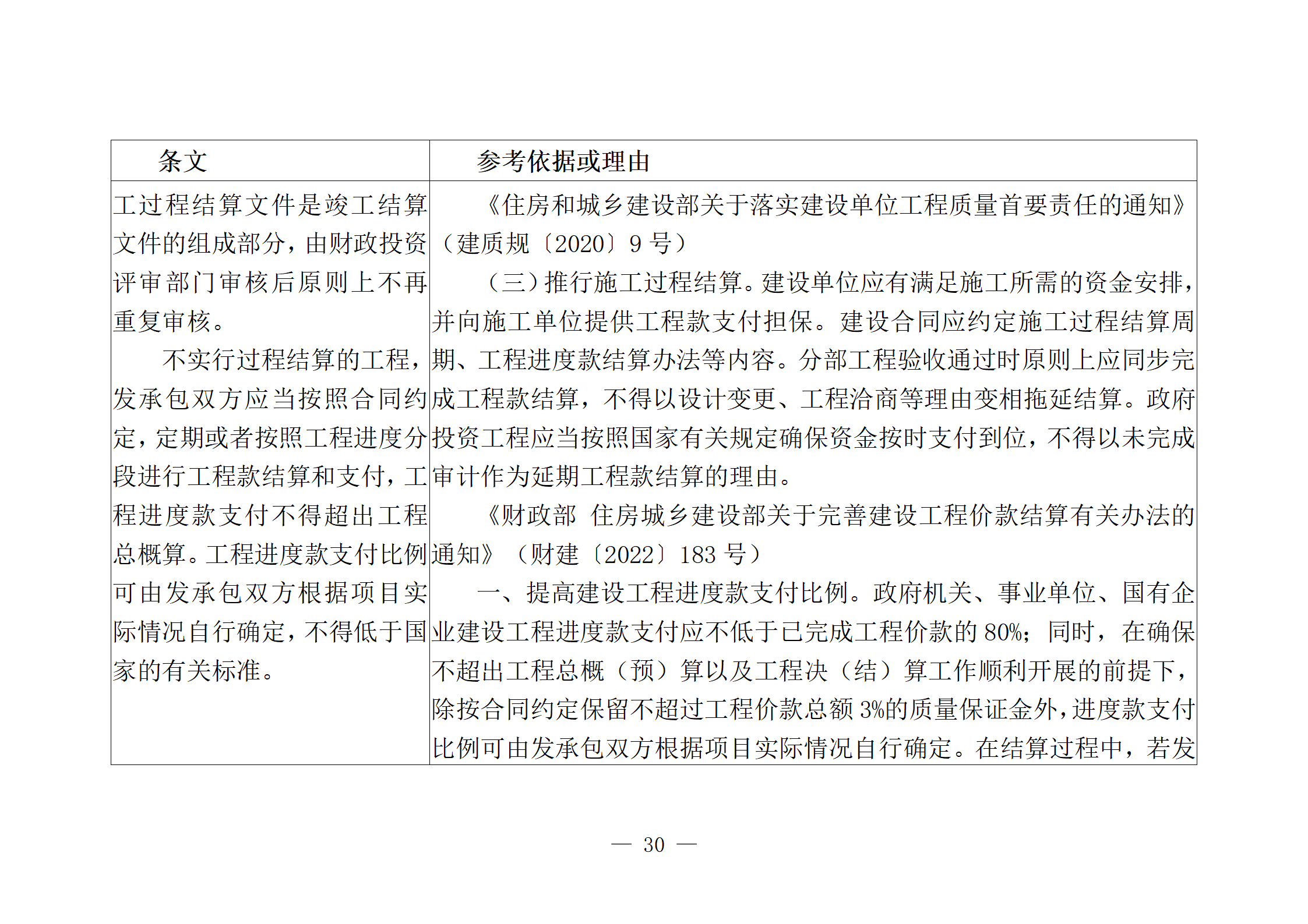 第十四條【價款結(jié)算】 施工工期一年以上的政府投資建設(shè)工程應(yīng)當(dāng)實(shí)行過程結(jié)算。實(shí)行過程結(jié)算的工程,發(fā)承包雙方根據(jù)合同約定,對結(jié)算周期內(nèi)已完工且無爭議的工程量(含變更、簽證、索賠等)進(jìn)行價款計算、確認(rèn)和支付。過程結(jié)算金額不得超出已完工部分對應(yīng)的批復(fù)概(預(yù))算。經(jīng)發(fā)承包雙方簽字認(rèn)可的施工過程結(jié)算文件是竣工結(jié)算文件的組成部分,由財政投資評審部門審核后原則上不再重復(fù)審核。