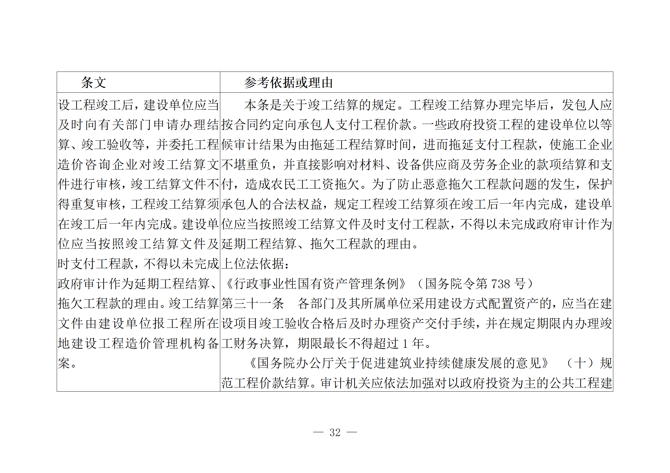 (七)針對加快工程結(jié)算速度,從源頭防止拖欠工程款和農(nóng)民工工資的問題,《規(guī)定》明確施工工期一年以上的政府投資建設(shè)工程應(yīng)實(shí)行過程結(jié)算,經(jīng)發(fā)承包雙方簽字認(rèn)可的施工過程結(jié)算文件是竣工結(jié)算文件的組成部分,由財政投資評審部門審核后原則上不再重復(fù)審核(第十四條);工程竣工后,建設(shè)單位應(yīng)及時辦理竣工結(jié)算,委托工程造價咨詢企業(yè)對竣工結(jié)算文件進(jìn)行審核,竣工結(jié)算文件不得重復(fù)審核,工程竣工結(jié)算須在竣工后一年內(nèi)完成。建設(shè)單位應(yīng)按照竣工結(jié)算文件及時支付工程款,不得以未完成政府審計作為延期工程結(jié)算、拖欠工程款的理由(第十五條),并規(guī)定了建設(shè)單位未及時支付工程款的處罰(第二十條)。