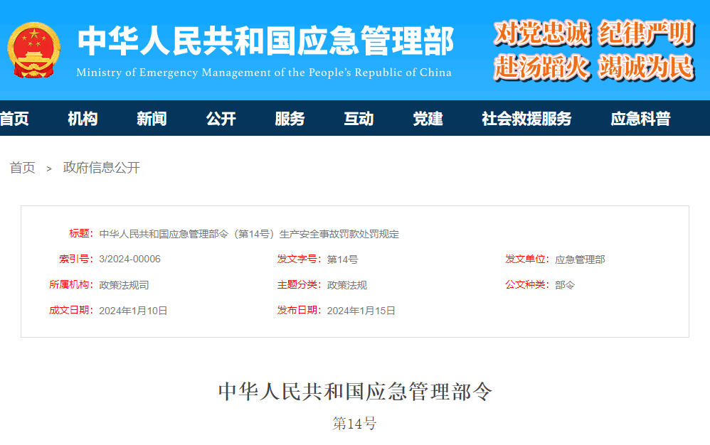 《生產(chǎn)安全事故罰款處罰規(guī)定》已經(jīng)2023年12月25日應(yīng)急管理部第32次部務(wù)會議審議通過,現(xiàn)予公布,自2024年3月1日起施行。