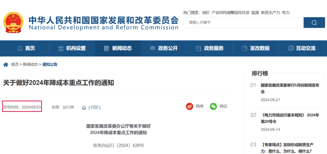 5月23日,國家發(fā)改委等四部門聯(lián)合發(fā)布《關(guān)于做好2024年降成本重點(diǎn)工作的通知》(發(fā)改辦運(yùn)行〔2024〕428號)。