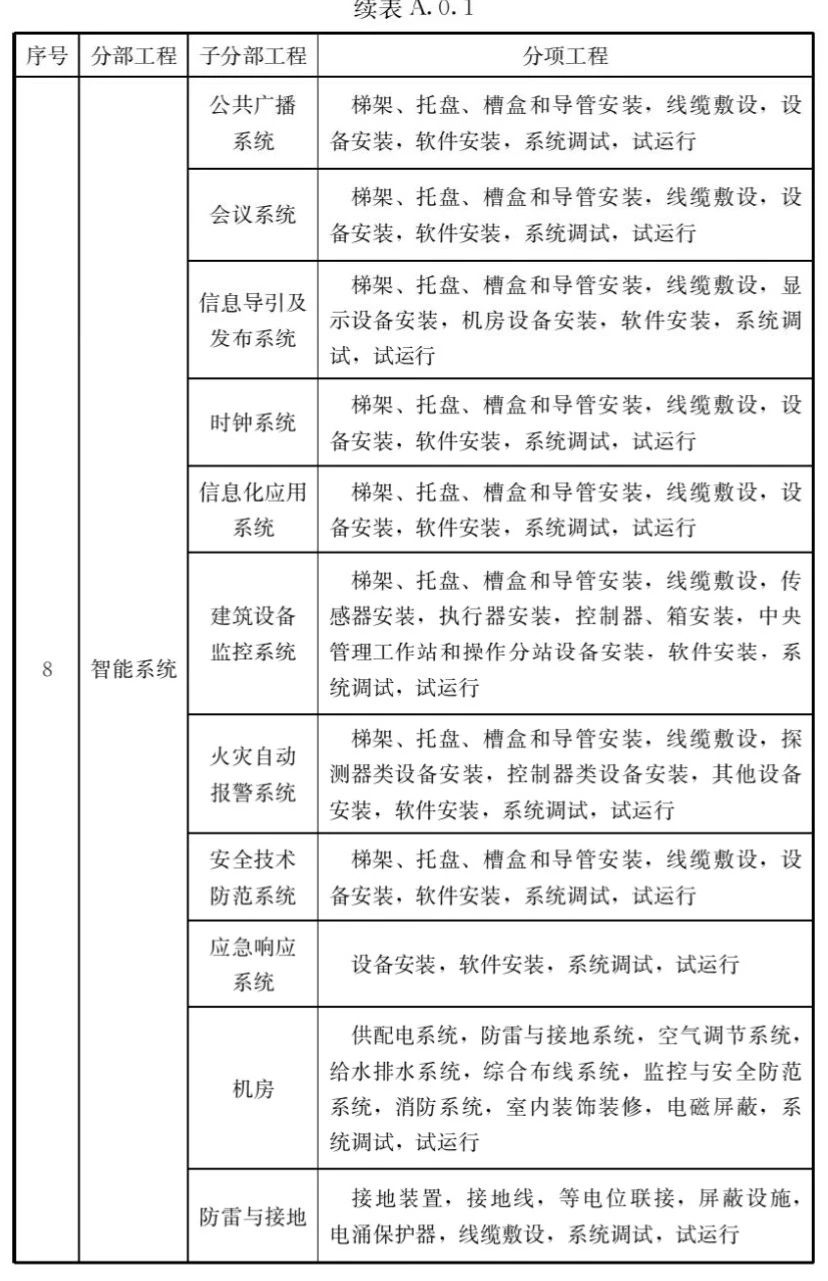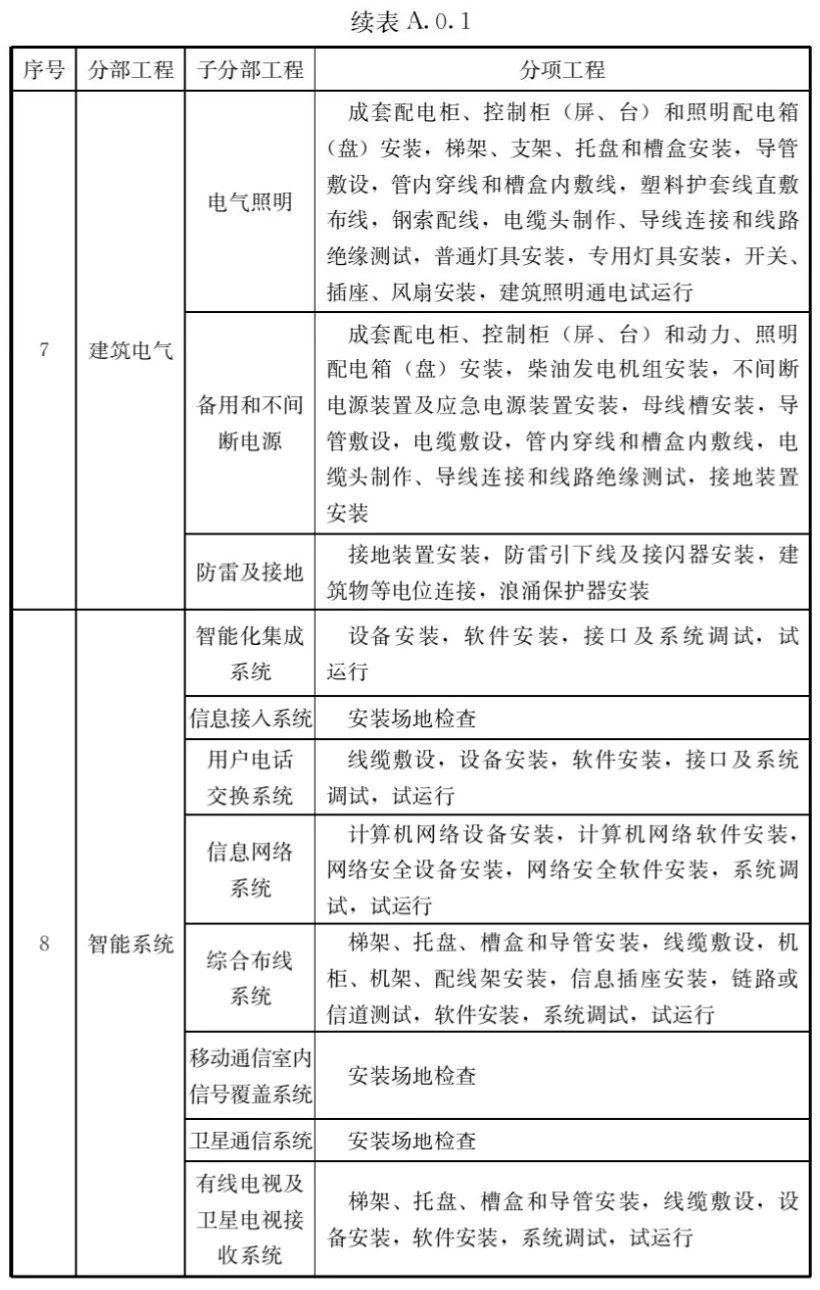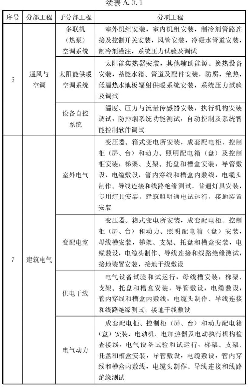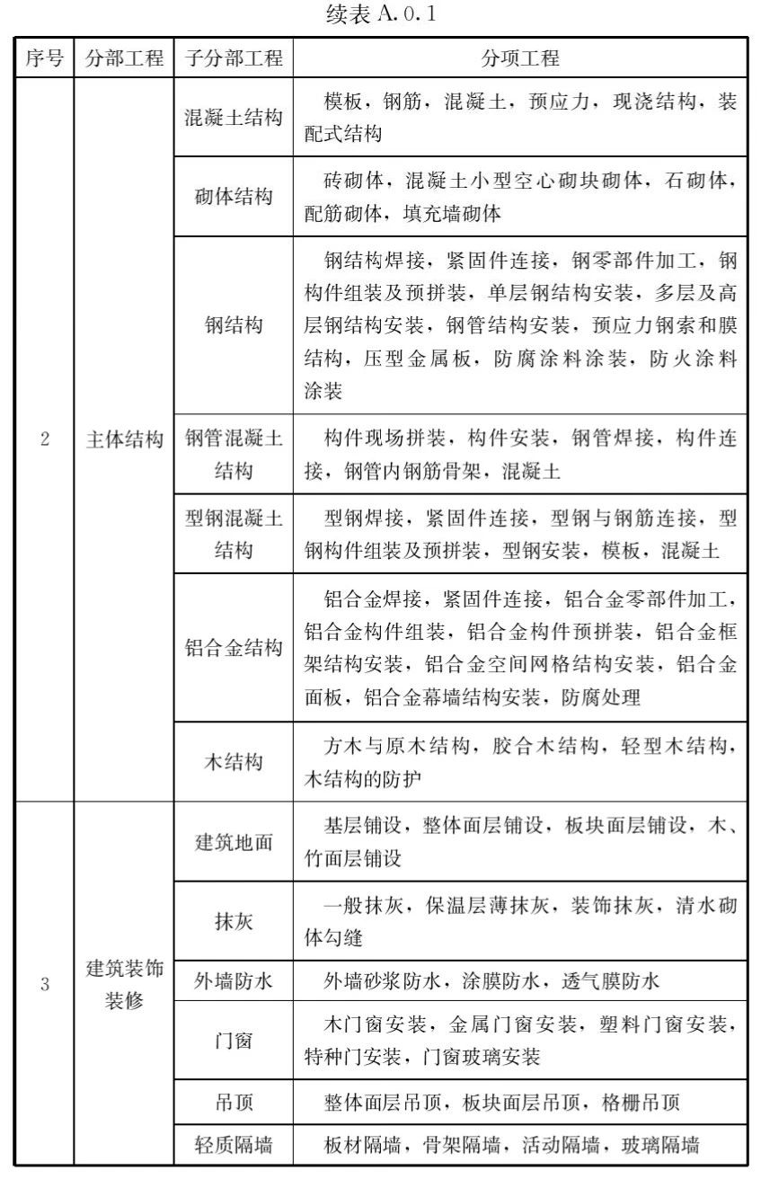 A.0.1建筑工程的分部工程、分項(xiàng)工程劃分應(yīng)符合表A.0.1的規(guī)定。