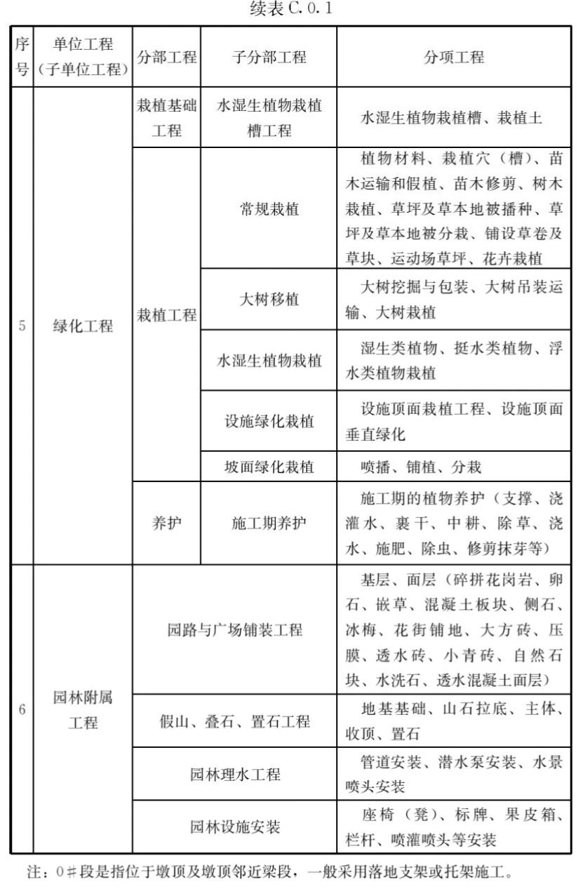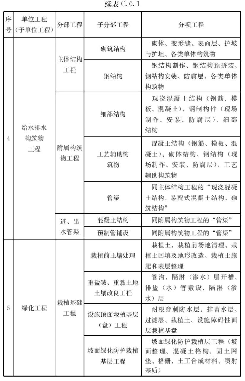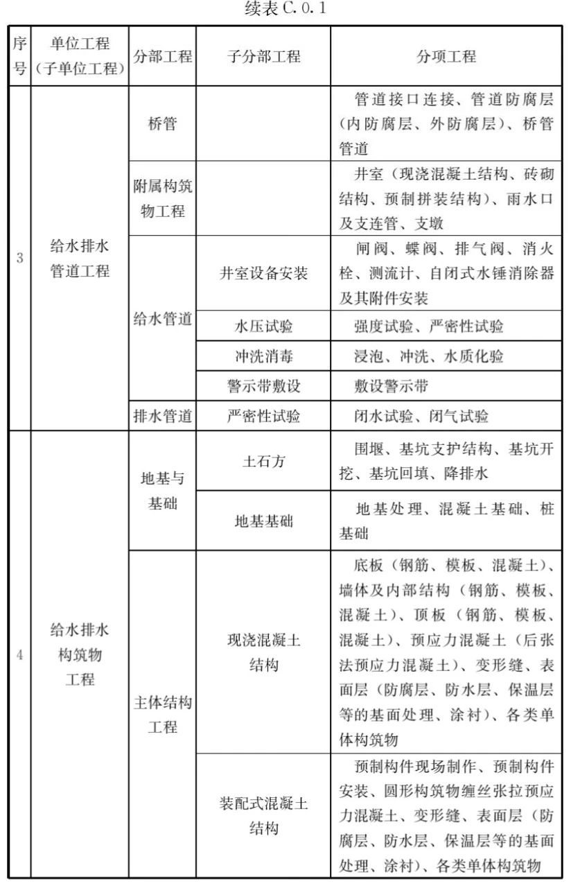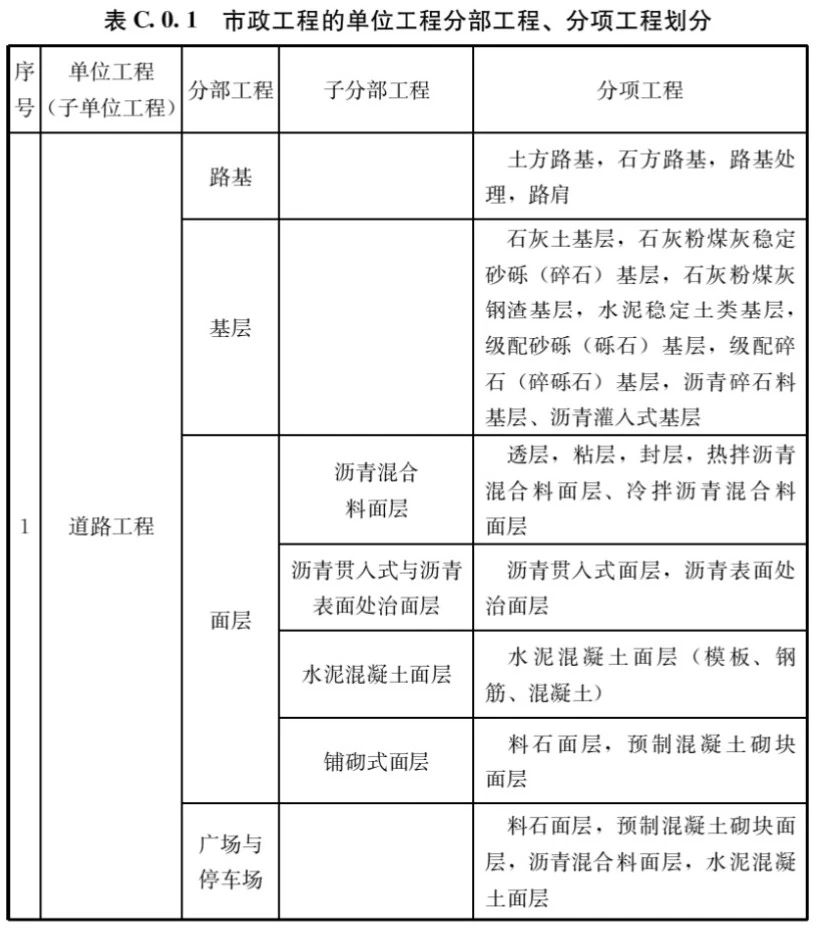 C.0.1市政工程的單位工程、分部工程、分項(xiàng)工程劃分應(yīng)符合表C.0.1的規(guī)定。